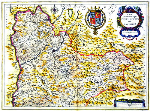 Titolo in alto a destra entro cartiglio decorato, accanto al quale compare lo stemma del Delfinato. |