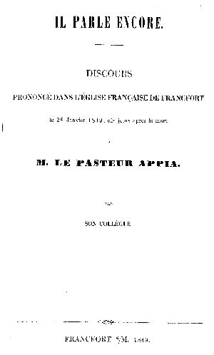 Il parle encore : Discours prononcé dans l'Église française de Francfort le 28 janvier 1849, dix jours après la mort de M. le pasteur Appia par son collègue