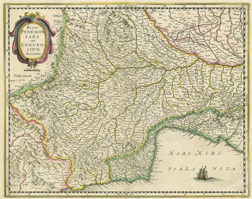 Contenuta in: G. Mercator, Atlas or A Geographicke description of the Regions... Riedizione, con nuovo titolo e cartiglio, della carta del Mercatore: “Pedemontana Regio cum Genuensium territorio et Montisferrati Marchionatu” del 1589 (cfr.), ripubblicata più volte in vari atlanti. La Val d’Angrogna è ancora situata a sud della Val Luserna. Bibliografia: F. Barrera, Il Piemonte nella cartografia del Cinquecento e Seicento, n. 27 (edita da I. Janssonius) ; Torino e il suo orizzonte, n. 29. |